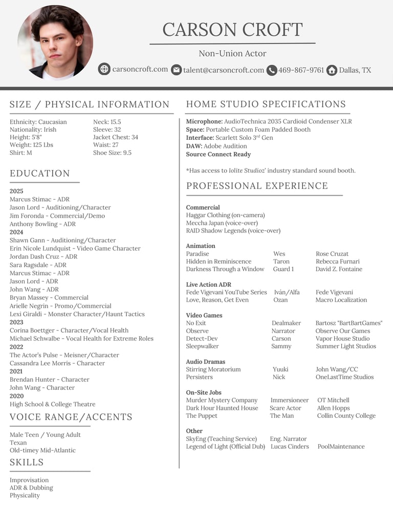 Carson Croft has made a career for himself as an Actor since 2020. His passion has led him to studying with many industry professionals in striving to become the best at his craft as he can.